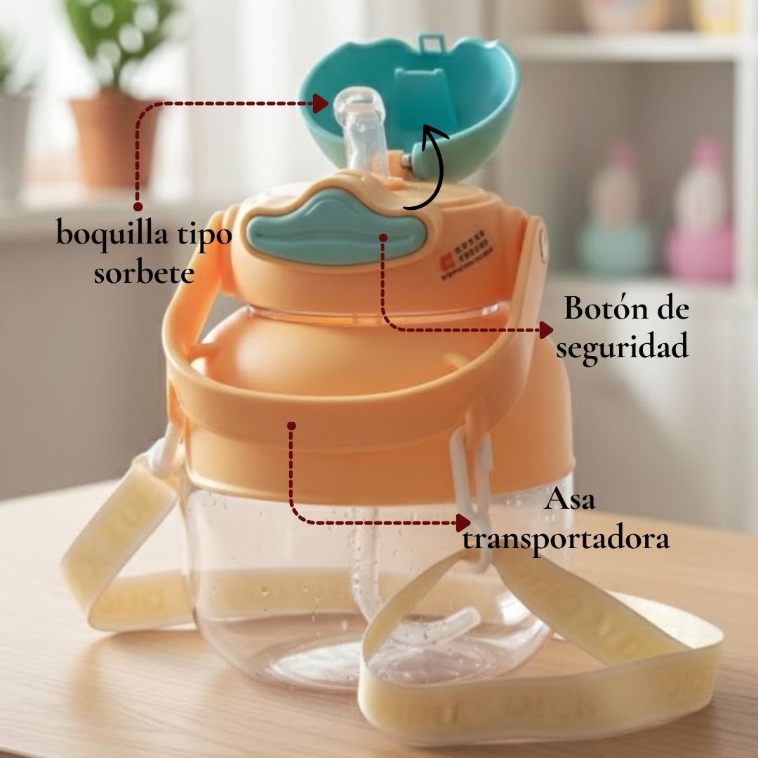 Gracias a su tamaño práctico y su sistema antiderrames, es perfecto para el colegio, paseos, viajes o actividades diarias, evitando accidentes y facilitando su uso autónomo.